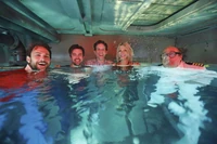 The Gang is now treading water with the brig nearly filled to the top with flood waters. Despondent, they ask Mac to pray to God one last time for a miracle. When nothing happens, they all give up treading water one by one to sink to the bottom of the brig. Underwater, the gang is serene and holds hands with each other. However, a sudden bright light shines from above and a large hand seems to reach for them from the opened brig door. The Gang breaks their peaceful moment, and scrambles over each other carelessly to be the first one pulled out.